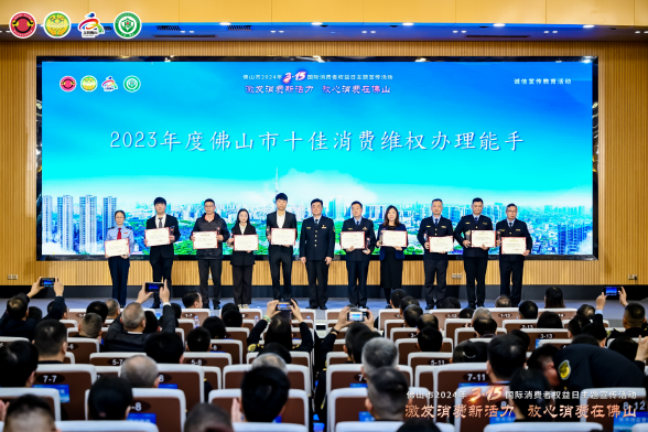 活動(dòng)現(xiàn)場(chǎng)還為2023年度佛山市及市場(chǎng)監(jiān)管系統(tǒng)的十佳消費(fèi)維權(quán)典型案例承辦單位、十佳消費(fèi)維權(quán)辦理能手,“放心消費(fèi)承諾”“線下無(wú)理由退貨承諾”單位,以及市級(jí)消費(fèi)教育基地單位等授牌。