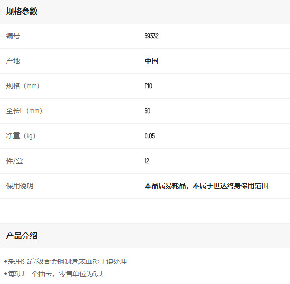 產(chǎn)品名字:世達(dá)5件6.3mm系列50mm旋具頭T10