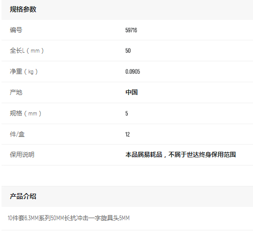 產(chǎn)品名字:世達10件套6.3MM系列50mm長一字旋具頭5MM